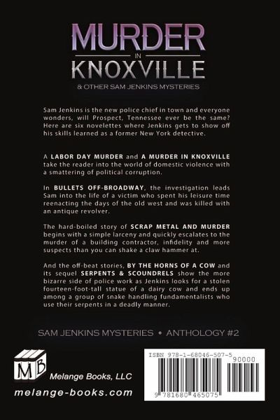 Sam Jenkins is the new police chief in town and everyone wonders, will Prospect, Tennessee ever be the same? A LABOR DAY MURDER and A MURDER IN KNOXVILLE take the reader into the world of domestic violence with a smattering of political corruption. In BULLETS OFF-BROADWAY, the investigation leads Sam into the life of a victim who spent his leisure time reenacting the days of the old west and was killed with an antique revolver. The hard-boiled story of SCRAP METAL AND MURDER begins with a simple larceny and quickly escalates into the murder of a building contractor, infidelity and more suspects than you can shake a claw hammer at. And the off-beat stories, BY THE HORNS OF A COW and its sequel SERPENTS & SCOUNDRELS show the more bizarre side of police work as Jenkins looks for a stolen fourteen-foot-tall statue of a dairy cow and ends up among a group of snake handling fundamentalists who use their serpents in a deadly manner.