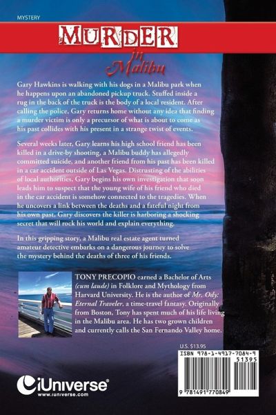 Gary Hawkins is walking with his dogs in a Malibu park when he happens upon an abandoned pickup truck. Stuffed inside a rug in the back of the truck is the body of a local resident. After calling the police, Gary returns home without any idea that finding a murder victim is only a precursor of what is about to come as his past collides with his present in a strange twist of events. Several weeks later, Gary learns his high school friend has been killed in a drive-by shooting, a Malibu buddy has allegedly committed suicide, and another friend from his past has been killed in a car accident outside of Las Vegas. Distrusting of the abilities of local authorities, Gary begins his own investigation that soon leads him to suspect that the young wife of his friend who died in the car accident is somehow connected to the tragedies. When he uncovers a link between the deaths and a fateful night from his own past, Gary discovers the killer is harboring a shocking secret that will rock his world and explain everything. In this gripping story, a Malibu real estate agent turned amateur detective embarks on a dangerous journey to solve the mystery behind the deaths of three of his friends.
