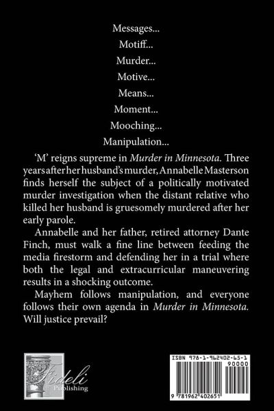 Messages...Motiff...Murder... Motive... Means...Moment... Mooching...Manipulation... 'M' reigns supreme in Murder in Minnesota. Three years after her husband's murder, Annabelle Masterson finds herself the subject of a politically motivated murder investigation when the distant relative who killed her husband is gruesomely murdered after her early parole. Annabelle and her father, retired attorney Dante Finch, must walk a fine line between feeding the media firestorm and defending her in a trial where both the legal and extracurricular maneuvering results in a shocking outcome. Mayhem follows manipulation, and everyone follows their own agenda in Murder in Minnesota. Will justice prevail?