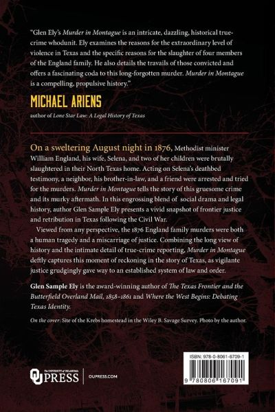 On a sweltering August night in 1876, Methodist minister William England, his wife, Selena, and two of her children were brutally slaughtered in their North Texas home. Acting on Selena's deathbed testimony, a neighbor, his brother-in-law, and a friend were arrested and tried for the murders. Murder in Montague tells the story of this gruesome crime and its murky aftermath. In this engrossing blend of true crime reporting, social drama, and legal history, author Glen Sample Ely presents a vivid snapshot of frontier justice and retribution in Texas following the Civil War. The sheer brutality of the Montague murders terrified settlers already traumatized by decades of chaos, violence, and fear-from the deadly raids of Comanche and Kiowa Indians to the terrors of vigilantes, lynchings, and Reconstruction lawlessness. But the crime's aftermath-involving five Texas governors, five trials at Montague and Gainesville, five appeals to the Texas Court of Appeals, and three life sentences at hard labor in the state's abominable and inhumane prison system-offered little in the way of reassurance or resolution. Viewed from any perspective, the 1876 England family murders were both a human tragedy and a miscarriage of justice. Combining the long view of history and the intimate detail of true crime reporting, Murder in Montague deftly captures this moment of reckoning in the story of Texas, as vigilante justice grudgingly gave way to an established system of law and order.