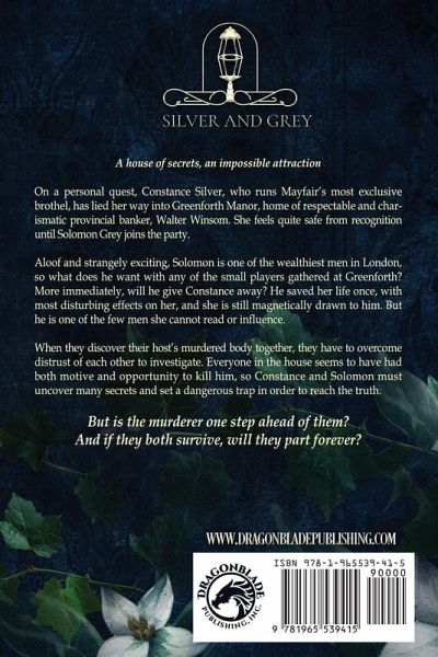 A house of secrets, an impossible attraction On a personal quest, Constance Silver, who runs Mayfair's most exclusive brothel, has lied her way into Greenforth Manor, home of respectable and charismatic provincial banker, Walter Winsom. She feels quite safe from recognition until Solomon Grey joins the party. Aloof and strangely exciting, Solomon is one of the wealthiest men in London, so what does he want with any of the small players gathered at Greenforth? More immediately, will he give Constance away? He saved her life once, with most disturbing effects on her, and she is still magnetically drawn to him. But he is one of the few men she cannot read or influence. When they discover their host's murdered body together, they have to overcome distrust of each other to investigate. Everyone in the house seems to have had both motive and opportunity to kill him, so Constance and Solomon must uncover many secrets and set a dangerous trap in order to reach the truth. But is the murderer one step ahead of them? And if they both survive, will they part forever? Silver and Grey Book 1 - Murder in Moonlight Book 2 - Evidence of Evil Book 3 - Ghost in the Garden Book 4 - The Trick of the Treasure Book 5 - Word of the Wicked