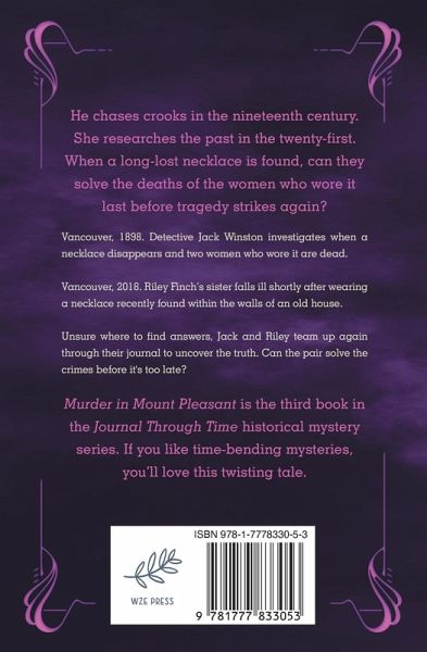 He chases crooks in the nineteenth century. She researches the past in the twenty-first. When a long-lost necklace is found, can they solve the deaths of the women who wore it last before tragedy strikes again? Vancouver, 1898. Detective Jack Winston investigates when a necklace disappears and two women who wore it are dead. Vancouver, 2018. Riley Finch's sister falls ill shortly after wearing a necklace recently found within the walls of an old house. Unsure where to find answers, Jack and Riley team up again through their journal to uncover the truth. Can the pair solve the crimes before it's too late? Murder in Mount Pleasant is the third book in the Journal Through Time historical mystery series. If you like time-bending mysteries, you'll love this twisting tale.