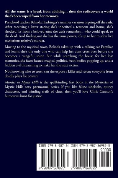 All she wants is a break from adulting... then she rediscovers a world that's been wiped from her memory. Preschool teacher Belinda Harbinger's summer vacation is going off the rails. After receiving a letter stating she's inherited a tearoom and home, she's shocked it's from a beloved aunt she can't remember... who could speak to the dead. And finding out she has the same power, it's up to her to solve her mysterious relative's murder. Moving to the mystical town, Belinda takes up with a talking cat Familiar and learns she's the only one who can help her aunt cross over before she becomes a vengeful spirit. But while searching the house for her lost memories, she faces heated magical politics, fresh bodies popping up, and a hidden evil threatening to make her the next victim. Not knowing who to trust, can she expose a killer and rescue everyone from deadly plays for power? Murder in Mystic Hills is the spellbinding first book in the Mysteries of Mystic Hills cozy paranormal series. If you like feline sidekicks, quirky characters, and winding trails of clues, then you'll love Chris Cannon's humorous hunt for justice.
