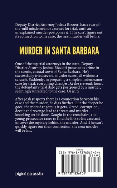 Deputy District Attorney Joshua Rizzetti has a run-of-the-mill misdemeanor case set for trial, until an unexplained murder postpones it. If he can't quickly figure out its connection to his case, the next murder will be his. MURDER IN SANTA BARBARA One of the top trial attorneys in the state, Deputy District Attorney Joshua Rizzetti prosecutes crime in the scenic, coastal town of Santa Barbara, California. He's successfully tried several murder cases, all without a scratch. Suddenly, in preparing a simple misdemeanor case for trial, everything changes. At the eleventh hour, the defendant's trial date gets postponed by a murder, seemingly unrelated to the case. Or is it? After Josh suspects there is a connection between his case and the murder, he digs further. But the deeper he goes, the more dangerous it gets. Greed, corruption, deceit and revenge lead to threats and murder knocking on his door. Caught in the crosshairs, the young prosecutor races to find the link to his case and uncover the mystery behind the murder. With only a few minor clues to guide him, can Josh solve the murder before it's too late?
