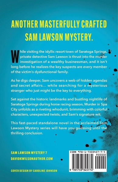 While visiting the idyllic resort town of Saratoga Springs, private detective Sam Lawson is thrust into the murder investigation of a wealthy businessman, and it isn't long before he realizes the key suspects are every member of the victim's dysfunctional family. From the grieving widow harboring dark secrets to the scheming adult children with their own hidden agendas, everyone has a motive. But as Sam uncovers their web of lies, affairs and corruption, a mysterious stranger lurks in the shadows, casting doubt on everything Sam thought he knew. Set against the historic landmarks and bustling nightlife of Saratoga Springs during horseracing season, Murder in Spa City unfolds as a riveting whodunit, brimming with colorful characters, unexpected twists, and Sam's signature wit. With each turn of the page, the stakes escalate, leaving you guessing until the thrilling conclusion. ¿¿Murder in Spa City is another masterfully crafted standalone novel in the acclaimed Sam Lawson Mystery series by David K. Wilson