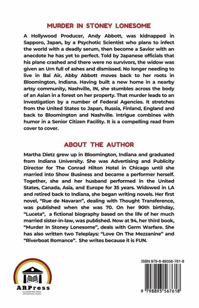 Martha Dietz grew up in Bloomington, Indiana and graduated from Indiana University. She was Advertising and Publicity Director for The Conrad Hilton Hotel in Chicago until she married into Show Business and became a performer herself. Together, she and her husband performed in the United States, Canada, Asia, and Europe for 35 years. Widowed in LA and retired back to Indiana, she began writing novels. Her first novel, "Rue de Navaran", dealing with Thought Transference, was published when she was 70. On her 90th birthday, "Luceta", a fictional biography based on the life of her much married sister-in-law, was published. Now at 94, her third book, "Murder In Stoney Lonesome", deals with Germ Warfare. She has also written two Teleplays: "Love On The Mezzanine" and "Riverboat Romance". She writes because it is FUN.