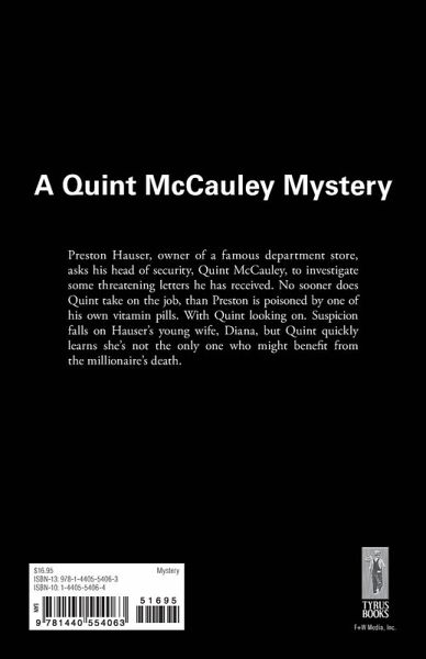 Preston Hauser, owner of a famous department store, asks his head of security, Quint McCauley, to investigate some threatening letters he has received. No sooner does Quint take on the job, than Preston is poisoned by one of his own vitamin pills. With Quint looking on. Suspicion falls on Hauser's young wife, Diana, but Quint quickly learns she's not the only one who might benefit from the millionaire's death.