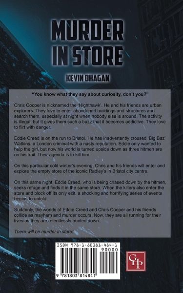 Murder in Store "You know what they say about curiosity, don't you?" Chris Cooper is nicknamed the 'Nighthawk'. He and his friends are urban explorers. They love to enter abandoned buildings and structures and search them, especially at night when nobody else is around. The activity is illegal, but it gives them such a buzz that it becomes addictive. They love to flirt with danger. Eddie Creed is on the run to Bristol. He has inadvertently crossed 'Big Baz' Watkins, a London criminal with a nasty reputation. Eddie only wanted to help the girl, but now his world is turned upside down as three hitmen are on his trail. Their agenda is to kill him. On this particular cold winter's evening, Chris and his friends will enter and explore the empty store of the iconic Radley's in Bristol city centre. On this same night, Eddie Creed, who is being chased down by the hitmen, seeks refuge and finds it in the same store. When the killers also enter the store and block off its only exit, a shocking and horrifying series of events begins to unfold. Suddenly, the worlds of Eddie Creed and Chris Cooper and his friends collide as mayhem and murder occurs. Now, they are all running for their lives as they are relentlessly hunted down. There will be murder in store!