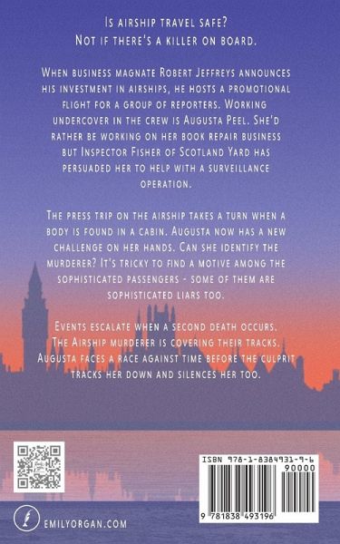 Is airship travel safe? Not if there's a killer on board. Former spy Augusta Peel would rather be repairing old books, but Scotland Yard persuades her to help with a surveillance operation. Despite a hatred of heights, she must work undercover on an airship. The trip takes a turn when a corpse is found in a cabin. Augusta now has a new challenge on her hands. Can she identify the murderer? It's tricky finding a motive among the sophisticated passengers - many are sophisticated liars too. Events escalate when the killer strikes again. The airship murderer is covering their tracks. Augusta faces a race against time before the culprit tracks her down and silences her too. A stylish, atmospheric tale of secrets and murder in 1920s London. Perfect for fans of Jacqueline Winspear, Rhys Bowen, and Agatha Christie.