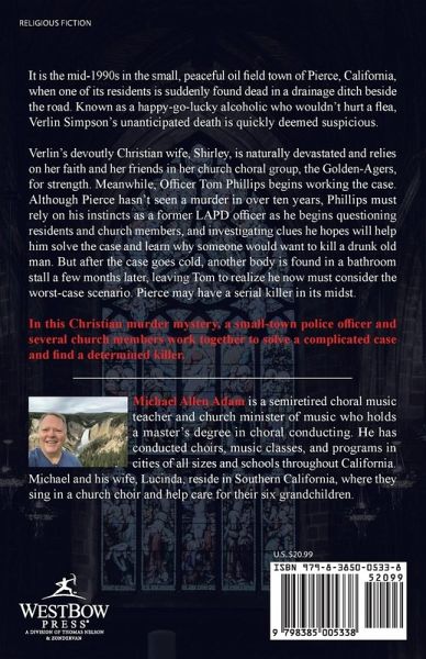 A Small-Town Murder: A Book for Mystery Booklovers! In small-town America, where time moves at the pace of a gentle breeze, -the peaceful facade of Pierce is shattered when a beloved Verlin Simpson is found lifeless in a roadside ditch. Known for his infectious laughter and a desire for the bottle, Verlin's unanticipated death sends shockwaves through the tight-knit community. His grieving widow, Shirley, finds peace in her faith and the comforting arms of her church and choir. But beneath the veneer of small-town piety, a darker truth lurks. Former LAPD officer Tom Phillips, now Pierce's local law enforcement, is tasked to hunt a killer. As he goes deeper into the case, a web of secrets unravels. With no clear motive and a town full of potential suspects, Phillips is forced to confront the possibility of a serial killer on the loose. When a second body turns up in a chilling location, his church, the once peaceful town, is filled with a sense of fear. Can Phillips crack the case before another innocent life is claimed? Or will the killer remain hidden in the shadows of Pierce? This Christian murder mystery is a tale of faith and the search for justice. Prepare to be drawn into a world where nothing is as it seems.''