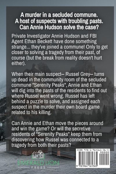 A murder in a secluded commune.A host of suspects with troubling pasts.Can Annie Hudson solve the case? Private Investigator Annie Hudson and FBI Agent Ethan Beckett have done something strange... they've joined a commune! Only to get closer to solving a tragedy from their past, of course (but the break from reality doesn't hurt either). When their main suspect-- Russel Grey-- turns up dead in the community room of the secluded commune "Serenity Peaks", Annie and Ethan will dig into the pasts of the residents to find out where Russel went wrong. Russel has left behind a puzzle to solve, and assigned each suspect in the murder their own board game related to his killing. Can Annie and Ethan move the pieces around and win the game? Or will the secretive residents of "Serenity Peaks" keep them from discovering how Russel was connected to a tragedy from both their pasts?