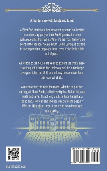 A murder case with twists and turns! A West End starlet and her aristocrat husband are hosting an anniversary party at their Buckinghamshire home. With a guest list from Who's Who, it's the most fashionable event of the season. Young sleuth, Lottie Sprigg, is excited to accompany her employer there; even if she feels a little out of place. All visitors to the house are keen to explore the tricky maze. How long will it take to find their way out? It's a challenge everyone takes on. Until one unlucky person never finds their way out at all... A murderer has struck in the maze! With the help of her four-legged friend Rosie, Lottie investigates. But as the case twists and turns, it's not long until she finds herself at a dead end. How can she find her way out of the puzzle? With the killer still at large, it proves to be a dangerous undertaking.