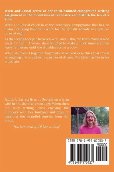 Wren and Rascal arrive at her third haunted campground writing assignment in the mountains of Tennessee and disturb the lair of a killer. Wren and Rascal check in at the Tennessee campground that has no history of being haunted except for the ghostly sounds of stock car races at night. As the feelings deepen between Wren and Justin, the town marshal who waits for her in Arizona, she's tempted to write a quick summary then leave Tennessee until she stumbles across a body. While she pieces together fragments of old and new clues that reveal an ongoing crime, a ghost warns her of danger. The killer has her in his crosshairs.