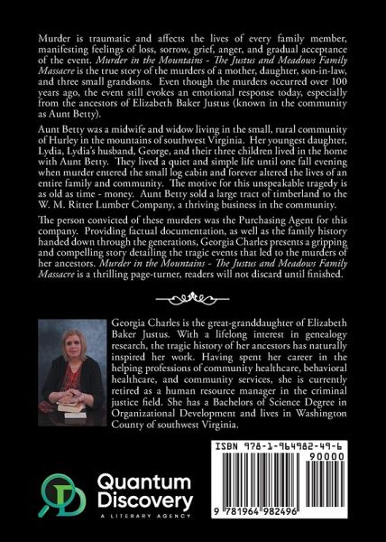 Murder is traumatic and affects the lives of every family member, manifesting feelings of loss, sorrow, grief, anger, and gradual acceptance of the event. Murder in the Mountains - The Justus and Meadows Family Massacre is the true story of the murders of a mother, daughter, son-in-law, and three small grandsons. Even though the murders occurred over 100 years ago, the event still evokes an emotional response today, especially from the ancestors of Elizabeth Baker Justus (known in the community as Aunt Betty). Aunt Betty was a midwife and widow living in the small, rural community of Hurley in the mountains of southwest Virginia. Her youngest daughter, Lydia, Lydia's husband, George, and their three children lived in the home with Aunt Betty. They lived a quiet and simple life until one fall evening when murder entered the small log cabin and forever altered the lives of an entire family and community. The motive for this unspeakable tragedy is as old as time - money. Aunt Betty sold a large tract of timberland to the W. M. Ritter Lumber Company, a thriving business in the community. The person convicted of these murders was the Purchasing Agent for this company. Providing factual documentation, as well as the family history handed down through the generations, Georgia Charles presents a gripping and compelling story detailing the tragic events that led to the murders of her ancestors. Murder in the Mountains - The Justus and Meadows Family Massacre is a thrilling page-turner, readers will not discard until finished. Georgia Charles is the great-granddaughter of Elizabeth Baker Justus. With a lifelong interest in genealogy research, the tragic history of her ancestors has naturally inspired her work. Having spent her career in the helping professions of community healthcare, behavioral healthcare, and community services, she is currently retired as a human resource manager in the criminal justice field. She has a Bachelors of Science Degree in Organizational Development and lives in Washington County of southwest Virginia.