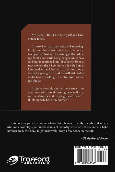 My name is Bill. I live by myself and have a story to tell. It started on a drizzly and cold morning. I'm just settling down in my easy chair, ready to enjoy that first sip of morning coffee, when my front door starts being banged on. It was so loud it reminded me of a scene from a movie when the SS comes to a Jewish home. I jumped up and hurried to the door, only to find a young man and a small girl curled under his arm, asking-no, pleading-to use my phone. I step to one side and let them enter-no questions asked. As the young man walks by me, he whispers so the little girl can't hear. "I think my wife has been murdered."