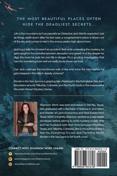 The most beautiful places often hide the deadliest secrets. Life in the mountains isn't as peaceful as Detective Jack Martin expected. Just as things settle down after his last case, a congressman's plane is blown out of the sky and comes to rest in the snowy peaks high above town. Jack's gut tells him it wasn't an accident. But while unraveling the mystery, he gets caught in the crossfire between deception and greed. And the deeper he digs, the more he puts his own life in danger. It's a grueling investigation that has him wondering how well we really know those we trust. Can Jack untangle the murderous web of lies and solve the case before he gets trapped in the killer's deadly scheme? Murder in the San Juans is a gripping tale of betrayal in the formidable San Juan Mountains around Telluride, Colorado, and the fourth book in the suspenseful Mountain Resort Mystery Series.