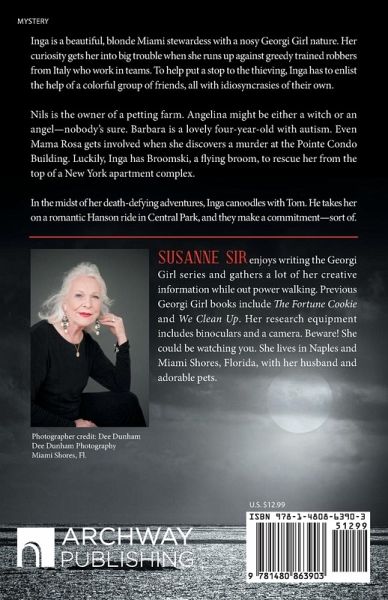Inga is a beautiful, blonde Miami stewardess with a nosy Georgi Girl nature. Her curiosity gets her into big trouble when she runs up against greedy trained robbers from Italy who work in teams. To help put a stop to the thieving, Inga has to enlist the help of a colorful group of friends, all with idiosyncrasies of their own. Nils is the owner of a petting farm. Angelina might be either a witch or an angel--nobody's sure. Barbara is a lovely four-year-old with autism. Even Mama Rosa gets involved when she discovers a murder at the Pointe Condo Building. Luckily, Inga has Broomski, a flying broom, to rescue her from the top of a New York apartment complex. In the midst of her death-defying adventures, Inga canoodles with Tom. He takes her on a romantic Hanson ride in Central Park, and they make a commitment--sort of.