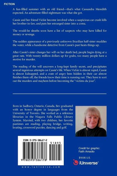 A fun-filled summer with an old friend-that's what Cassandra Meredith expected. An adventure-filled nightmare was what she got. Cassie and her friend Vickie become involved when a suspicious car crash kills her brother-in-law, and puts her estranged sister into a coma. The would-be sleuths soon have a list of suspects who may have killed for money or revenge. The sudden appearance of a previously unknown Brazilian half-sister muddies the water, while a handsome detective from Cassie's past heats things up. After Cassie's sister changes her will on her death bed, people begin dying at a great rate. With twenty million dollars up for grabs, too many people have a motive for murder. The reading of the will uncovers a long-kept family secret, and precipitates several ingenious attempts on Cassie's life. When Vickie is almost raped, Cassie is almost kidnapped, and a crate of angry bees hidden in their car almost finishes them off, the friends know their time is running out. They have to sort out the murders and mayhem before becoming the 'victims du jour".