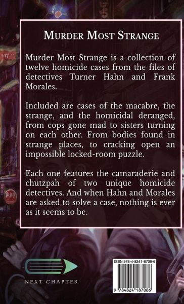 Murder Most Strange is a collection of twelve homicide cases from the files of detectives Turner Hahn and Frank Morales. Included are cases of the macabre, the strange, and the homicidal deranged, from cops gone mad to sisters turning on each other. From bodies found in strange places, to cracking open an impossible locked-room puzzle. Each one features the camaraderie and chutzpah of two unique homicide detectives. And when Hahn and Morales are asked to solve a case, nothing is ever as it seems to be.