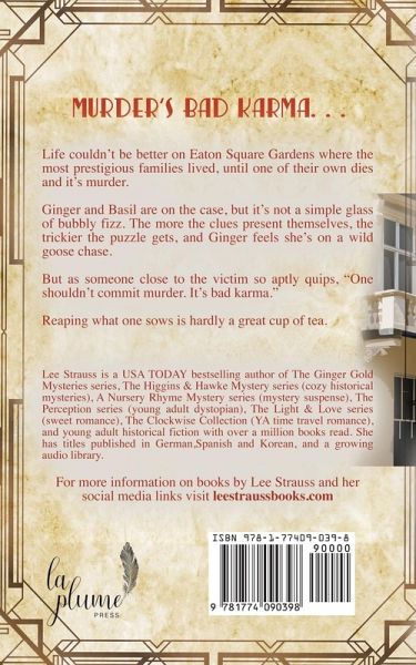 Murder’s Bad Karma. . . Life couldn’t be better on Eaton Square Gardens where the most prestigious families lived, until one of their own dies and it’s murder. Ginger and Basil are on the case, but it’s not a simple glass of bubbly fizz. The more the clues present themselves, the trickier the puzzle gets, and Ginger feels she’s on a wild goose chase. But as someone close to the victim so aptly quips, "One shouldn’t commit murder. It’s bad karma." Reaping what one sows is hardly a great cup of tea.