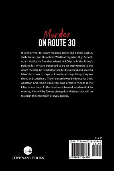 It's senior year for Adam Madlock, Derek and Bonnie Baglish, Zach Brehm, and Humphrey Warth at Eagerton High School. Adam Madlock is found murdered at 8:00 p.m. in the St. Joe's parking lot. What is supposed to be an intervention to get Adam the help he needed to turn his life around and save his friendship turns to tragedy. As each person pulls up, they see sirens and squad cars. They're interviewed by detectives Chris Appleton and Jeanie Pinkerton. One of these friends is the killer, or are they? As the days turn into weeks and weeks into months, lives will be forever changed, and friendships will be tested in the small town of Dyer, Indiana.
