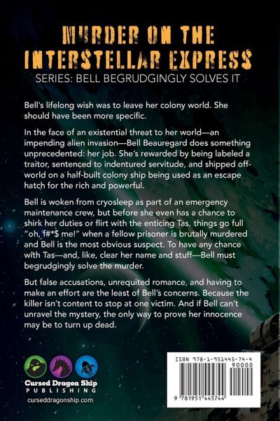 For fans of The Murderbot Diaries by Martha Wells who wanted a bit more swearing and dereliction of duty. Bell's lifelong wish was to leave her colony world. She should have been more specific. In the face of an existential threat to her world-an impending alien invasion-Bell Beauregard does something unprecedented: her job. She's rewarded by being labeled a traitor, sentenced to indentured servitude, and shipped off-world on a half-built colony ship being used as an escape hatch for the rich and powerful. Bell is woken from cryosleep as part of an emergency maintenance crew, but before she even has a chance to shirk her duties or flirt with the enticing Tas, things go full "oh, f#*$ me!" when a fellow prisoner is brutally murdered and Bell is the most obvious suspect. To have any chance with Tas-and, like, clear her name and stuff-Bell must begrudgingly solve the murder. But false accusations, unrequited romance, and having to make an effort are the least of Bell's concerns. Because the killer isn't content to stop at one victim. And if Bell can't unravel the mystery, the only way to prove her innocence may be to turn up dead.
