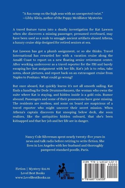 A travel feature turns into a deadly investigation for Kat Lawson when she discovers a missing passenger, presumed overboard, may have been used as a mule to smuggle ancient artifacts aboard Athena, a luxury cruise ship designed for retired seniors at sea. Kat Lawson has got a plumb assignment, or so she thinks. Travel International has rewarded her with a vacation cruise along the Amalfi Coast to report on a new floating senior retirement center. After working undercover as a travel reporter for the FBI and barely escaping her last assignment with her life, Kat's job is to relax, take notes, shoot pictures, and report back on an extravagant cruise from Naples to Positano. What could go wrong? But once aboard, Kat quickly learns it's not all smooth sailing. Kat finds a handbag for Dede Drummerhausen, the woman who owns the suite where Kat is staying, and hidden inside is a gold coin. Rumor abound. Passengers and some of their possessions have gone missing. The residents are restless, and some on board are suspicious of a travel reporter who might uncover their secret mission. When Athena's captain discovers Kat snooping below deck, she soon realizes, like the antiquities hidden onboard, that she's been kidnapped and that her job and her life are in danger.