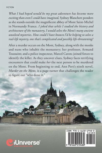 What I hoped would be my great adventure has become more exciting than even I could have imagined, Sydney Blanchett ponders as she stands outside the magnificent abbey of Mont Saint-Michel in Normandy France. I joked that while I studied the history and architecture of the monastery, I would solve the Mont's many ancient unsolved mysteries. How could I have known I'd be helping to solve a real-life mystery, one that's complicated and possibly life-threatening? After a murder occurs on the Mont, Sydney, along with the monks and nuns who inhabit the monastery; her professor, Armand Toussaint; and a police inspecteur, Marcel Caron; set out to identify the killer. As they uncover clues, Sydney faces terrifying encounters that could make her the next person to be murdered on the Mont. From beginning to end, Ann Port's ninth novel, Murder on the Mont, is a page-turner that challenges the reader to figure out "who done it."