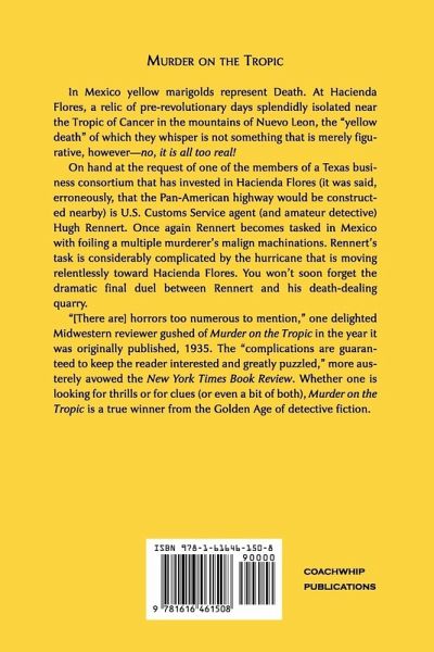 In Mexico yellow marigolds represent Death. At Hacienda Flores, a relic of pre-revolutionary days splendidly isolated near the Tropic of Cancer in the mountains of Nuevo Leon, the "yellow death" of which they whisper is not something that is merely figurative, however-no, it is all too real! On hand at the request of one of the members of a Texas business consortium that has invested in Hacienda Flores (it was said, erroneously, that the Pan-American highway would be constructed nearby) is U. S. Customs Service agent (and amateur detective) Hugh Rennert. Once again Rennert becomes tasked in Mexico with foiling a multiple murderer's malign machinations. Rennert's task is considerably complicated by the hurricane that is moving relentlessly toward Hacienda Flores. You won't soon forget the dramatic final duel between Rennert and his death-dealing quarry. "[There are] horrors too numerous to mention," one delighted Midwestern reviewer gushed of Murder on the Tropic in the year it was originally published, 1935. The "complications are guaranteed to keep the reader interested and greatly puzzled," more austerely avowed the New York Times Book Review. Whether one is looking for thrills or for clues (or even a bit of both), Murder on the Tropic is a true winner from the Golden Age of detective fiction. Additional mysteries available from CoachwhipBooks.com.