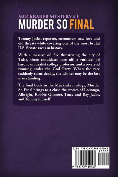 Tommy Jacks, reporter/political columnist, encounters new love and old threats while covering one of the most brutal U.S. Senate races in history. With a massive oil fire threatening the city of Tulsa, three candidates face off, a ruthless oil baron, an idealist college professor, and a reverend running under the God Party. When the race suddenly turns deadly, the winner may be the last man standing. Final book in the Muckraker trilogy, Murder So Final brings to a close the stories of Louongo, Albright, Robbie Gilmore, Tracy and Ray Jacks, and Tommy himself.