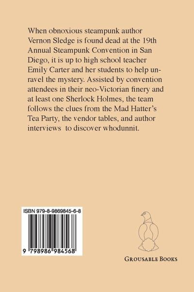 When obnoxious steampunk author Vernon Sledge is found dead at the 19th Annual Steampunk Convention in San Diego, it is up to high school teacher Emily Carter and her students to help unravel the mystery. Assisted by convention attendees in their neo-Victorian finery and at least one Sherlock Holmes, our team follows the clues from the Mad Hatter's Tea Party, the vendor tables, and author interviews to discover whodunnit.