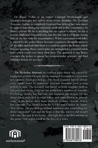 Dr Bruce Noble is an expert Criminal Psychologist and Neuropsychologist but suffers from severe disability. His Personal Assistant, Sophie, is completely loyal and has delayed her own career to support him during his university work and police consultancy. In Bruce's private life he is anything but the typical academic; he has a serious drink and drug addiction, but also has one foot on the wrong side of the law with his acquaintances. When a potential serial killer is missed by the police Bruce becomes suspicious about the motives of the killer and feels that there is a vendetta against the police, which they are ignoring. Bruce and Sophie are entangled in a potential witch hunt which could cost them their lives. The question is can Bruce convince the police to ignore his extracurricular activities and find the killer before it's too late?