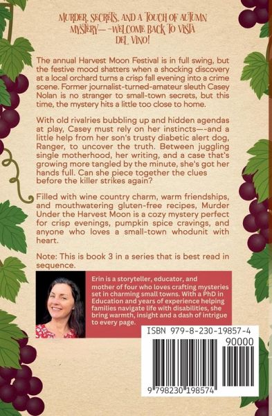 A crisp autumn night, a golden harvest...and a murder that leaves everyone shaken. Under the glow of the Harvest Moon, what should be a festive evening at a picturesque apple orchard takes a deadly turn. Former investigative journalist Casey Nolan thought she was finally settling into her new life in Vista del Vino, surrounded by family, friends, and plenty of wine. But when a shocking murder stirs up long-buried secrets, bitter rivalries, and hidden debts, Casey finds herself tangled in a mystery as twisted as the orchard's gnarled branches. With her sharp instincts, a nose for trouble, and her son's ever-loyal diabetic alert dog, Ranger, keeping her company on the investigative trail, Casey is determined to unearth the truth-before the killer takes another life. But in a town where past and present intertwine, solving the case means leaning heavily on the people who have become her second family. Perfect for fans of cozy mysteries with heart, Murder Under the Harvest Moon blends small-town charm, tightly woven suspense, and the warmth of found family. Set against the stunning backdrop of Southern California wine country, this third book in the Vista del Vino series is best enjoyed in sequence. With gluten-free recipes and book club discussion questions included, this is one deliciously immersive mystery you won't want to miss. Pour yourself a glass and start sleuthing today!