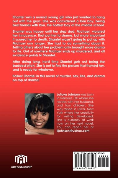 Synopsis Shantel was a normal young girl who just wanted to hang out with the guys. She was considered a tom boy, being best friends with Ron the hottest boy at the middle school. Shantel was happy until her step dad Michael, violated her innocence. That put her to shame, but more important it scared her to death. Shantel wasn't going to put up with Michael any longer. She had to do something about it. Telling others about her problem only brought more drama to life. Out of nowhere Michael ends up murdered, and all evidence points to Shantel. After doing long, hard time Shantel gets out being the baddest bitch. She is out to find the person that framed her, and is ready for whatever. Follow Shantel in this novel of murder, sex, lies, and drama on top of drama!