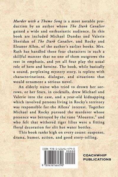 Murder with a Theme Song is a most notable production by an author whose The Dark Cavalier gained a wide and enthusiastic audience. In this book are included Michael Dundas and Valerie Sheridan of The Dark Cavalier, and Rocky and Eleanor Allen, of the author’s earlier books. Mrs. Rath has handled these four characters in such a skillful manner that no one of them outgrows the rest in emphasis, and yet all four play the usual role of hero and heroine. The book, while basically a sound, perplexing mystery story, is replete with characterizations, dialogue, and situations that would ornament a serious novel. An elderly nurse who tried to drown her sorrows, or her fears, in cocktails, drew Michael and Valerie into the case, and a year-old kidnapping which involved persons living in Rocky’s territory was responsible for the Allens’ interest. Together Michael and Rocky pursued the murderer whose presence was betrayed by the tune "Alouette," and who felt that withered tiger lilies were a fitting floral decoration for slit hot water bottles. This book ranks high on every count: suspense, drama, humor, action, and good story-telling. Murder with a Theme Song was published in 1939. For more classic detective ficiton, visit CoachwhipBooks.com.