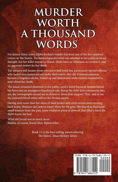 For almost thirty years, Alpha Bodine's murder has been one of the few unsolved crimes in The Sisters. The beloved grandmother was attacked in her parlor in broad daylight, but her killer was never found. There were no witnesses, no evidence, and no apparent motive for her death. The mystery still haunts those who knew and loved her, particularly elected officials who hadn't seen justice served under their watch. Her old Victorian mansion became a forgotten shrine, locked up and abandoned while rumors continued to swirl about her death. The house remained shuttered to the public, until a failed business venture forced her heirs into an emergency liquidation sale. Being the close-knit community they are, the townspeople turned out in droves to show their support. That, and to see the rumored blood stains still on the Persian carpet. Having seen more than her share of dead bodies and crime scenes since moving back home, Madison deCordova wasn't there for the gore. She hoped to find some small treasure from the past, some trinket or piece of artwork that filled a need she didn't know she had. What she found was so much more. Maddy, of course, found Miss Alpha's killer. Book 12 in the best-selling, award-winning The Sisters, Texas Mystery Series.