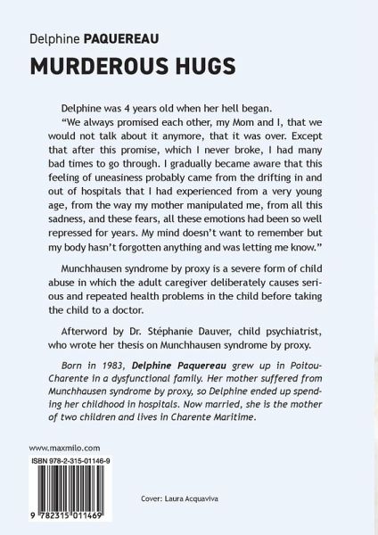 Delphine was 4 years old when her hell began. "We always promised each other, my Mom and I, that we would not talk about it anymore, that it was over. Except that after this promise, which I never broke, I had many bad times to go through. I was always trying to find out why I felt so bad about myself, why the fear of dying came over me again, as in childhood. I gradually became aware that this feeling of uneasiness probably came from the drifting in and out of hospitals that I had experienced from a very young age, from the way my mother manipulated me, from all this sadness, and these fears, all these emotions had been so well repressed for years. My mind doesn't want to remember but my body hasn't forgotten anything and was letting me know." Munchhausen syndrome by proxy is a severe form of child abuse in which the adult caregiver deliberately causes serious and repeated health problems in the child before taking the child to a doctor. Afterword by Dr. Stéphanie Dauver, child psychiatrist, who wrote her thesis on Munchhausen syndrome by proxy.