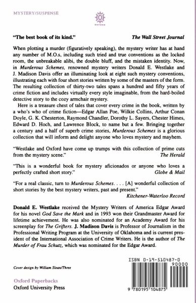 When plotting a murder (figuratively speaking), the mystery writer has at hand any number of M.O.s, including such tried and true conventions as the locked room, the unbreakable alibi, the double bluff, and the mistaken identity. Now, in Murderous Schemes, renowned mystery writers Donald E. Westlake and J. Madison Davis offer an illuminating look at eight such mystery conventions, illustrating each with four short stories written by some of the masters of the form. The resulting collection of thirty-two tales spans a hundred and fifty years of crime fiction and includes virtually every style imaginable, from the hard-boiled detective story to the cozy armchair mystery. the differences between American and British detective fiction, and they illuminate the evolution of crime writing over time. Here is a glorious treasure chest of tales that cover every crime in the book, written by a who's who of crime fiction-Edgar Allan Poe, Wilkie Collins, Arthur Conan Doyle, G. K. Chesterton, Raymond Chandler, Dorothy L. Sayers, Chester Himes, Edward D. Hoch, and Lawrence Block, to name but a few. Bringing together a century and a half of superb crime stories, Murderous Schemes is a glorious collection that will inform and delight anyone who loves mystery and mayhem.