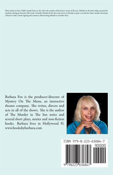 Three books in One! Murder in the Inn, Another Murder in the Inn and Murder in Another Inn combined into one book, Follow Sandy Evans as she solves the murder of the former owner of the inn, (Murder in the Inn), helps unmask the murderer during an Exercise/Diet week (Another Murder In the Inn) and moves to Florida to open a second inn where murder interrupts a Passover seder, a book signing and a mystery club meeting (Murder in Another Inn)