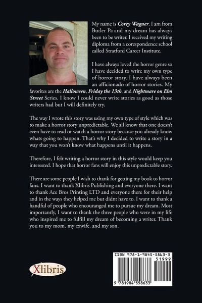 My name is Corey Wagner. I am from Butler Pa and my dream has always been to be writer. I received my writing diploma from a corespondence school called Stratford Career Institute. I have always loved the horror genre so I have decided to wrire my own type of horror story. I have always been an afficionado of horror stories. My favorites are the Halloween, Friday the 13th, and Nightmare on Elm Street Series. I know I could never write stories as good as those writers had but I will definitely try. The way I wrote this story was using my own type of style which was to make a horror story unpredictable. We all know that one doesn't even have to read or watch a horror story because you already know whats going to happen. That's why I decided to write a story in a way that you won't know what happens until it happens. Therefore, I felt writing a horror story in this style would keep you interested. I hope that horror fans will enjoy this unpredictable story. There are some people I wish to thank for getting my book to horror fans. I want to thank Xlibris Publishing and everyone there. I want to thank Ace Bros Printing LTD and everyone there for their help and in the ways they helped me but didnt have to. I want to thank a handful of people who encouranged me to pursue my dream. Most importantly, I want to thank the three people who were in my life who inspired me to fulfill my dream of becoming a writer. Thank you to my mom, my exwife, and my son.