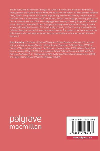 This book reviews Iris Murdoch's thought as a whole. It surveys the breadth of her thinking, taking account of her philosophical works, her novels and her letters. It shows how she explored many aspects of experience and brought together apparently contradictory concepts such as truth and love. The volume deals with her notions of truth, love, language, morality, politics and her life. It shows how she offers a challenging provocative way of seeing things which is related to but distinct from standard forms of analytical philosophy and Continental thought. Unlike so many philosophers she does offer a philosophy to live by and unlike many novelists she has reflected deeply on the kind of novels she aimed to write. The upshot is that her novels and her philosophy can be read together productively as contributions to how we can see others and the world.