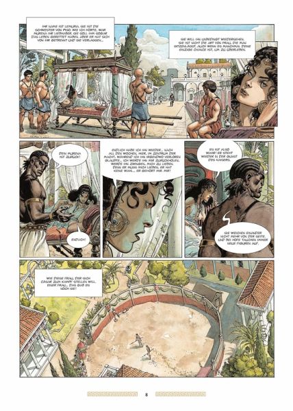 Jean Dufaux (»Giacomo C.«, »Kreuzzug«, »Conquistador« etc.), Philippe Delaby und jetzt Theo (»Der tönerne Thron«) haben exakt dieses düster schillernde Kapitel der römischen Kaiserzeit gewählt, um mit »Murena« ein packendes historisches Drama zu inszenieren, das geschickt geschichtliche Fakten und Fiktion miteinander verwebt. Im Mittelpunkt steht neben Nero vor allem der gleichaltrige Lucius Murena, mit ersterem anfangs durchaus befreundet. Er gerät jedoch schon früh in die tödlichen Intrigen bei Hofe und wird so zum erbitterten GegnerNeros, der mehr und mehr dem Cäsarenwahn verfällt. Das alles präsentieren Dufaux und Theo vor einem detaillierten Panorama der antiken Lebenswelt, penibel recherchiert und akribisch umgesetzt. Und nebenbei geben sie auch noch eine Antwort darauf, wer nun Rom wirklich angezündet hat. Und warum. Schon heute ein Klassiker des History-Comics.