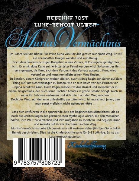 Im Jahre 549: Für Prinz Kuno von Harubia gibt es nur einen Weg. Er will ein ehrenhafter Krieger werden und kein König.Doch dem herrschsüchtigen Ratgeber seines Vaters, El Consejero, genügt dies nicht. Er ahnt, dass Kuno sein erbittertster Feind werden wird. So kommt es ihm sehr gelegen, als Kuno sich dem Verdacht des Verrats aussetzt. Kuno wird verstoßen und muss nun allein seinen Weg finden.In Zeralon, einem Königreich weiter südlich, sucht König Ragin den Seher auf dem Thing auf, um sich weissagen zu lassen, wie er sein Reich vor den Prinzen von Dejana schützen kann. Doch Ragin missdeutet das Orakel und so kommt er zu einem Trugschluss, der auch seine Tochter Amudis in große Gefahr bringt. Auch sie muss ihr Zuhause verlassen und sich allein auf den Weg machen.Murias Vermächtnis hat Rebekka Jost gemeinsam mit ihrem siebenjährigen Sohn Luke-Benoit Ulmer geschrieben. Es ist als Kinderbuch für Kinder von 6-13 Jahre und als Erwachsenenroman für alle ab 14 Jahren erschienen. Dieses ist das Kinderbuch. Es ist als Leselernbuch gestaltet.
