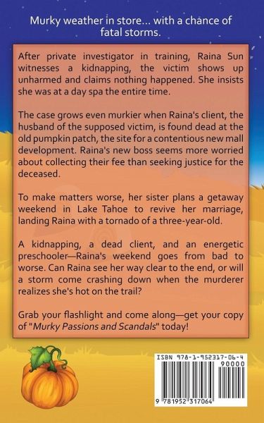 Murky weather in store... with a chance of fatal storms. After Raina Sun witnesses a kidnapping, the victim shows up unharmed and claims she was at a day spa. The case grows even murkier when Raina's client, the husband of the supposed victim, is found dead at the old pumpkin patch, the site for a contentious new mall development. Raina's new boss seems more worried about collecting their fee than finding the killer. To make matters worse, Raina's sister plans a getaway weekend in Lake Tahoe to revive her marriage, landing Raina with a tornado of a three-year-old. A kidnapping, a dead client, and an energetic preschooler--Raina's weekend goes from bad to worse. Can Raina see her way clear to the end, or will a storm come crashing down when the murderer realizes she's hot on the trail? Grab your flashlight and come along--get your copy of "Murky Passions and Scandals" today!