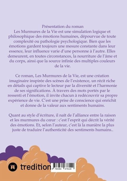 Présentation du romanLes Murmures de la Vie est une simulation logique et philosophique des émotions humaines, dépourvue de toute complexité ou pathologie psychologique. Bien que les émotions gardent toujours une mesure constante dans leur essence, leur influence varie d'une personne à l'autre. Elles demeurent, en toutes circonstances, la nourriture de l'âme et du corps, ainsi que la source infinie des multiples couleurs de la vie.Ce roman, Les Murmures de la Vie, est une création imaginaire inspirée des scènes de l'existence, un récit riche en détails qui captive le lecteur par la diversité et l'harmonie de ses significations. À travers des mots portés par le ressenti et l'émotion, il invite chacun à redécouvrir sa propre expérience de vie. C'est une prise de conscience qui enrichit et donne de la valeur aux sentiments humains.Quant au style d'écriture, il naît de l'alliance entre la raison et les murmures du coeur : c'est l'esprit qui décrit la vérité des émotions. Et, selon l'auteur, c'est là la manière la plus juste de traduire l'authenticité des sentiments humains.