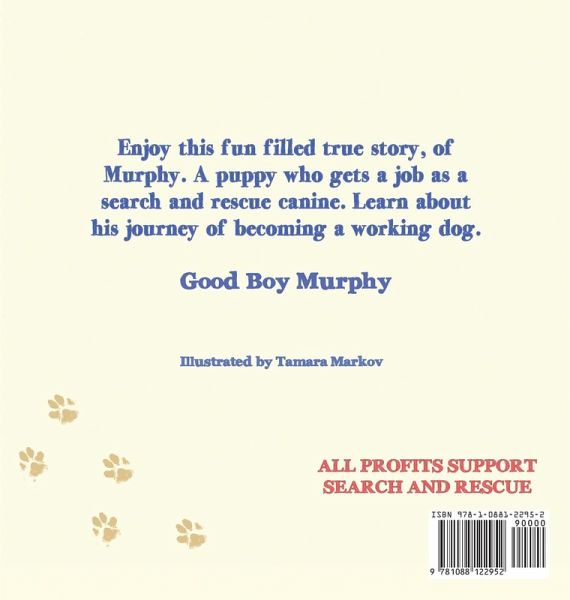 Enjoy this fun filled true story, of Murphy. A puppy who gets a job as a search and rescue canine. Learn about his journey of becoming a working dog. Good Boy Murphy. ALL PROFITS SUPPORTSEARCH AND RESCUE