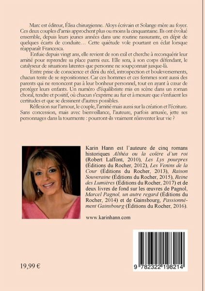 Marc est éditeur, Élisa chirurgienne, Aloys écrivain et Solange mère au foyer. Ces deux couples d'amis approchent plus ou moins la cinquantaine. Ils ont évolué ensemble, depuis leurs jeunes années, dans une routine rassurante, en dépit de quelques écarts de conduite... Cette quiétude vole pourtant en éclat lorsque réapparaît Francesca.Enfuie depuis vingt ans, elle revient de son exil et cherche à reconquérir leur amitié pour reprendre sa place parmi eux. Elle sera, à son corps défendant, le catalyseur de situations latentes que personne ne soupçonnait jusque-là.Entre prise de conscience et déni du réel, introspection et bouleversements, chacun tente de se repositionner. Car ces hommes et ces femmes sont aussi des parents qui ne renoncent pas à leur bonheur personnel, tout en ayant à coeur de protéger leurs enfants. Un numéro d'équilibriste mis en scène dans un roman choral, tendre et positif, où chacun s'exprime au fur et à mesure que s'enfuient les certitudes et que se dessinent d'autres possibles.Réflexion sur l'amour, le couple, l'amitié, mais aussi sur la création, la poésie et l'écriture. Sans concession, mais avec bienveillance, l'auteure, parfois amusée, jette ses personnages dans la tourmente : pourront-ils vraiment réinventer leur vie ?