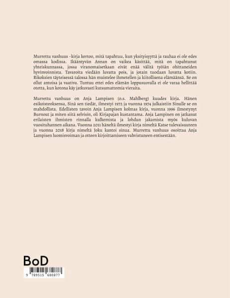 Murrettu vanhuus -kirja kertoo, mitä tapahtuu, kun yksityisyyttä ja rauhaa ei ole edes omassa kodissa. Ikääntyvän Annan on vaikea käsittää, mitä on tapahtunut yhteiskunnassa, jossa viranomaiset eivät enää välitä työiän ohittaneiden hyvinvoinnista. Tavaroita viedään luvatta pois, ja jotain tuodaan luvatta kotiin. Rikoksien täyteisessä talossa hän muistelee ihmetellen ja kiitollisena elämäänsä. Se on ollut antoisa ja vaativa. Tuntuu ettei edes elämän loppusuoralla ole varaa hellittää otetta, kun kotona käy jatkuvasti kutsumattomia vieraita.