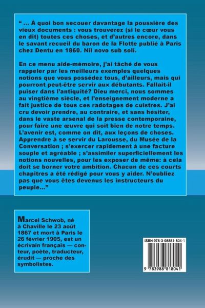 " ... À quoi bon secouer davantage la poussière des vieux documents : vous trouverez (si le c¿ur vous en dit) toutes ces choses, et d'autres encore, dans le savant recueil du baron de la Flotte publié à Paris chez Dentu en 1860. Nil novo sub soli. En ce menu aide-mémoire, j'ai tâché de vous rappeler par les meilleurs exemples quelques notions que vous possédez tous, d'ailleurs, mais qui pourront peut-être servir aux débutants. Fallait-il puiser dans l'antiquité? Dieu merci, nous sommes au vingtième siècle, et l'enseignement moderne a fait justice de tous ces radotages de cuistres. J'ai cru devoir prendre, au contraire, et sans hésiter, dans le vaste arsenal de la presse contemporaine, pour faire une ¿uvre qui soit bien de notre temps. L'avenir est, comme on dit, aux leçons de choses. Apprendre à se servir du Larousse, du Musée de la Conversation ; s'exercer rapidement à une facture souple et agréable ; s'assimiler superficiellement les notions nouvelles, pour les exposer de même: à cela doit se borner votre ambition. Chacun de ces courts chapitres a été rédigé pour vous y aider. N'oubliez pas que vous êtes devenus les instructeurs du peuple..."