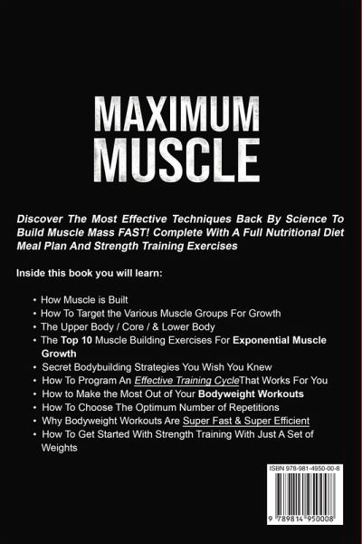Discover How You Can Build Maximum Muscle Mass With The Least Amount of Effort Right Now! Are you tired of endless workouts that do not deliver the results that you set out to achieve from the beginning? Are you sick of spending countless hours without having anything to show for it? What If I Told You There Was A Way To Shorten The Time It Took You To Achieve Those Results? When it comes to Building Muscle Mass, you need to understand the importance of setting up a plan that is sustainable and effective. Most people do not get the results they set out to achieve due to a lack of information, adequate nutrition, and proper customized workout routines, In "Maximum Muscle" you will learn and find... How Muscle is Really Built The Reasons Why Most People Fail In Getting Bigger 10 Rules to Increase your Muscle Mass Tips and Tricks to Keep Making Gains Putting Together A Proper Training Schedule How To Work On Each Targeted Muscle Group Effectively How To Pick The Right Number of Repetitions Focusing On Bodyweight Workouts To Improve Results The Correct Way To Perform Workouts That Targets The Upper Body, Lower Body, Core, and Legs How Your Diet Affects The Quality of Your Workouts How To Set Yourself Up For Success Discover The Benefits of the Ketogenic Diet To Compliment Your Workout Routine Proper Breathing Techniques To Employ How To Keep Your Training Fun and Enjoyable Even In Difficult and Stressful Times And so much more… Let's Get Those Big Ass Muscles That You've Always Wanted To Look Amazing In Those Clothes You Desperately Want To Fit In! Pick up your copy of the book right now by clicking the BUY NOW button at the top of this page! To Your Success!